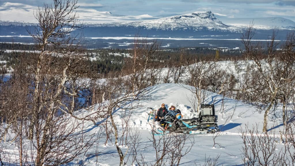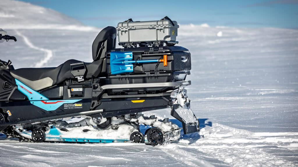 Det er én ting å levere når man kjører lett, men noe helt annet når scooteren er fullpakket, med slede bak og en passasjer på salen. Her imponerer Commander RE for alvor. Fjæringen gjør en solid jobb med å holde det hele sammen, selv når vekten øker betraktelig. Den svelger ujevnheter og beholder stabiliteten, noe som gjør at man kan holde et bra tempo uten at det føles anstrengt eller nervøst. Ergonomien er også en sterk side. Kjørestillingen fungerer like bra sittende under transport som stående ved aktiv kjøring. Det er enkelt å bevege kroppen og finne riktig balanse, uansett situasjon. Bagasjemulighetene på tunnelen bidrar ytterligere til helheten. Med vesker og utstyr på plass forvandles scooteren raskt til en ekte eventyrmaskin, klar for heldager (eller flerdagersturer) ute på fjellet.
